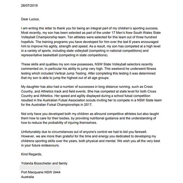 Dear Lucius, I am writing this letter to thank you for being an integral part of my children's sporting success. Most recently, my son has been selected as part of the under 17 Men's New South Wales State Volleyball Championship team. Ten athletes were selected for this team out of three hundred hopefuls [more]